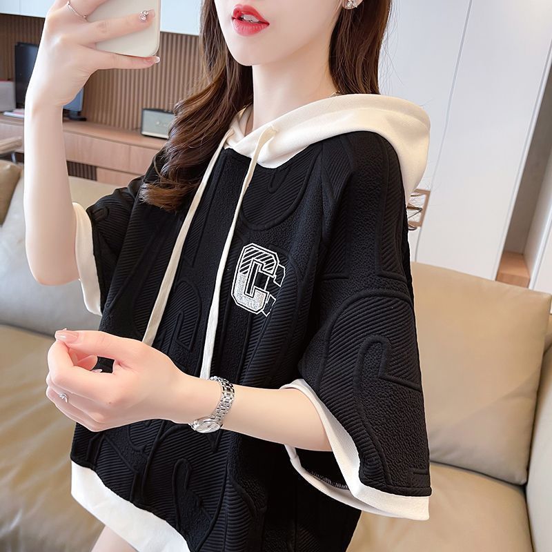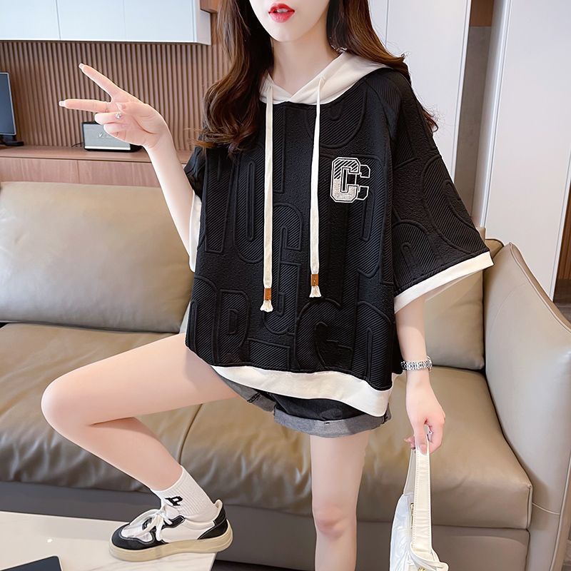 フード付きデザインでスポーティーな印象を演出し、半袖仕様で春夏シーズンにぴったりのレディースアイテムです。